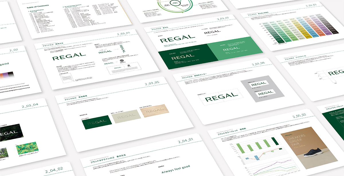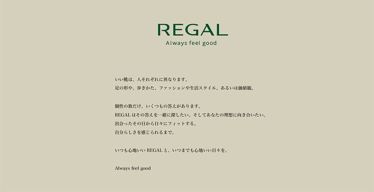 調査から分かったターゲットの欲求は、これまで考えてきたような、革の味わいを楽しむ頑丈で伝統的な靴ではなく、生活の質を上げてくれる靴。生活の質そのものの向上なのでした。こうしてREGALは、今までの自 らの思い込みを更新して、ターゲットとするお客様に「Always feel good」を約束するブランドに舵を切ることになりました。ブランドアイデンティティもこの約束を基に刷新し、「森の中で深呼吸するような心地よさ」を感じるブランドと定義して、製品はもちろん、店舗デザインやコミュニケーション、ECやデジタル施策などにもこのテーマに沿ったものと方向性を定めました。